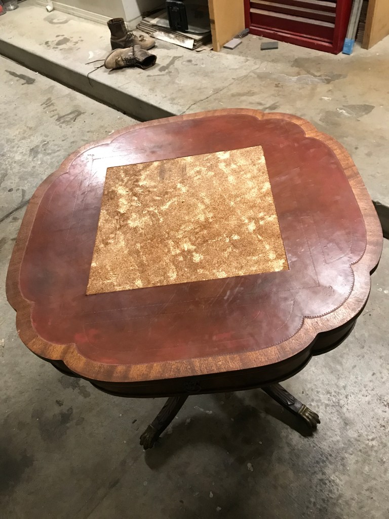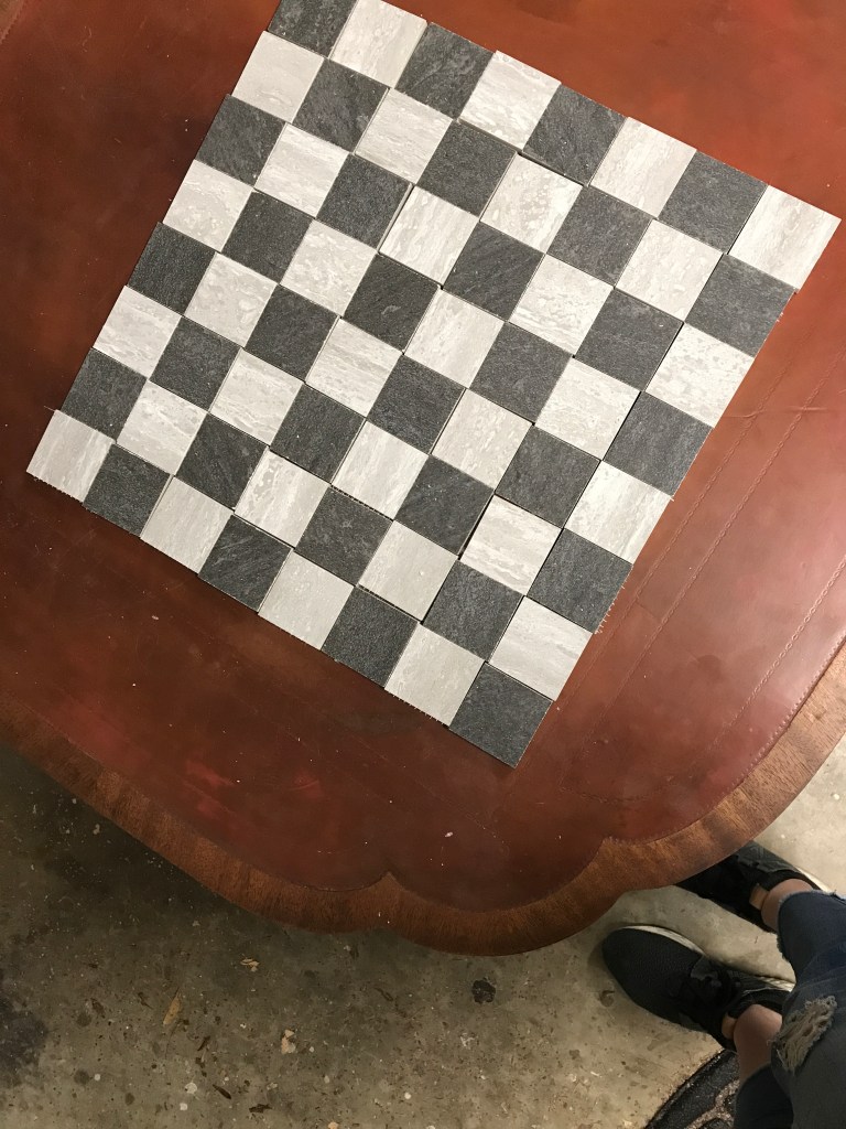 To make the chess top, I bought tiles from Lowe’s that were already precut squares so I didn’t need a tile saw. I laid them out dry to determine my dimensions, then started marking my tabletop. Getting the top layer of leather up was more of a challenge than I bargained for, the adhesive used had been meant to last.