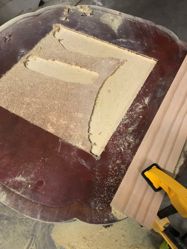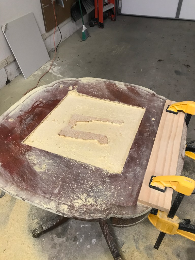 I then used my router to create space to lay the tile into. I’m not going to lie, I was pretty nervous about this part. Let’s just say my router and I haven’t always gotten along in the past, and its been sitting on the shelf for months and months because of that. I was determined to make this work though, so I clamped a piece of wood down as a guide and got to work. This part was actually a lot easier than I thought, but it did take some time.